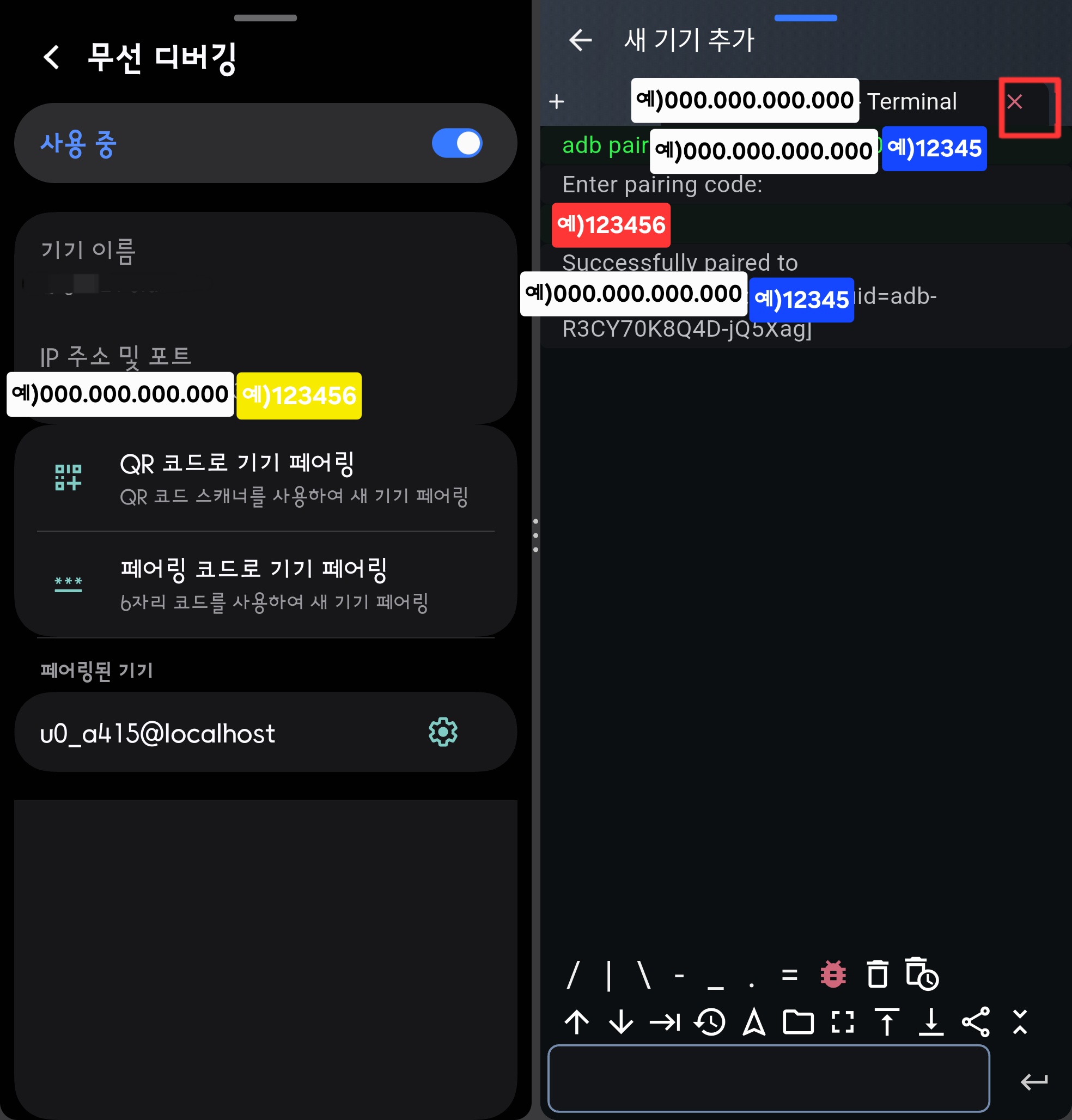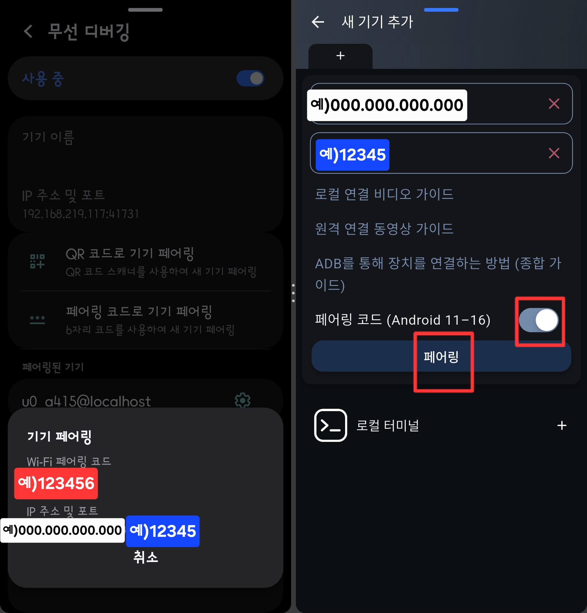 - 개발자옵션> '무선 디버깅' 메뉴에서 페어링 코드로 기기 페어링을 누릅니다.