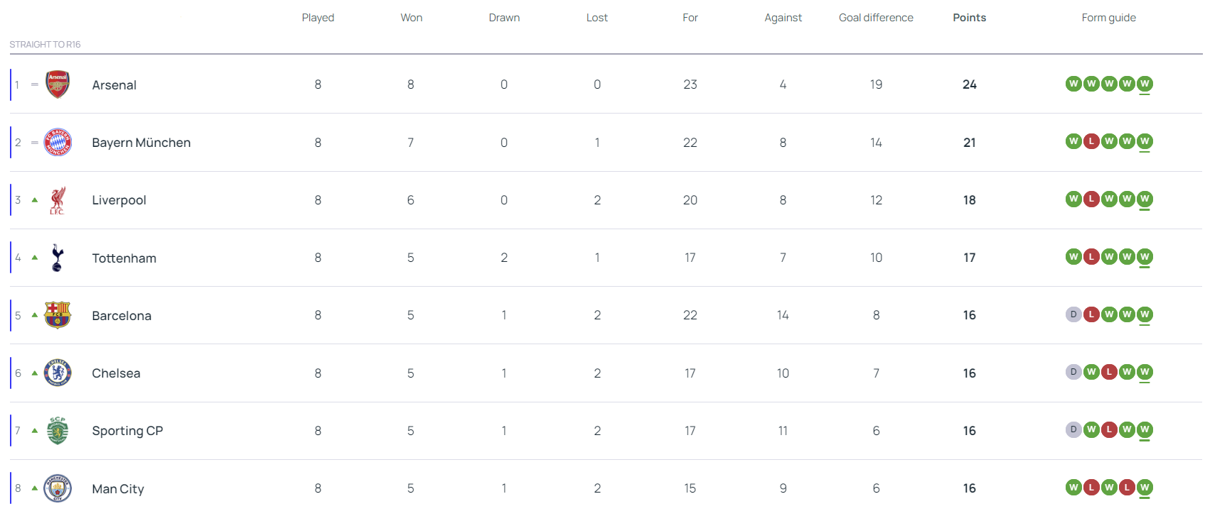 리그페이즈 최종 순위 및 16강 직행 팀 (TOP8)
